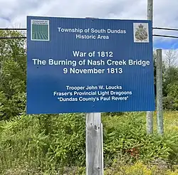 The small skirmish did not deter Wilkinson from advancing towards Cornwall on the 9th, and by late afternoon his army had marched through Matilda and Williamsburg townships. As the American forces pushed east through Williamsburg township, Trooper John W. Loucks of Fraser's Provincial Light Dragoons, formerly of the 1st Dundas Regiment, was on duty at the bridge over Nash Creek.[4] When the advance parties of the American army came into view, Trooper Loucks set fire to the Nash Creek Bridge to prevent their advance and to signal the position of the enemy. He then rode east to alert the Dundas and Stormont Milita before riding north and west around the American force to contact the British forces coming from Kingston under Gen. Morrison.[5]