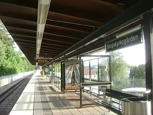 Skogskyrkogården metro station is on the green line of the Stockholm metro, located in Gamla Enskede, Söderort, very close to the cemetery Skogskyrkogården (the Woodland Cemetery). The station was opened on 1 October 1950 as part of the inaugural stretch of Stockholm metro between Slussen and Hökarängen.[2] The distance to Slussen is 5 km (3.1 mi).