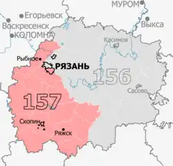 2016–present: Alexandro-Nevsky District, Korablinsky District, Mikhaylovsky District, Miloslavsky District, Pronsky District, Ryazan (Oktyabrsky, Zheleznodorozhny), Ryazansky District (Iskrovskoye, Okskoye, Podvyazyevskoye, Rovnovskoye, Semyonovskoye, Turlatovskoye, Tyushevskoye, Vyshetravinskoye, Vysokovskoye, Yekimovskoye), Ryazhsky District, Sapozhkovsky District, Skopin, Skopinsky District, Starozhilovsky District, Ukholovsky District, Zakharovsky District[2]