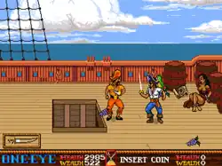 The game is playable in single and co-op modes, where the objective of both players is to rescue their kidnapped princess from the antagonist, a wizard. Player one controls One-Eye, and player two controls Red Dog. Gameplay consists of players fighting through waves of enemies and level bosses, such as Medusa and Ship Captains, collecting weapons and booty to become increasingly powerful. Collectable items are centred around the pirate theme, such as the cutlass or flintlock pistol.