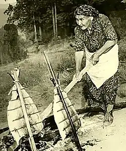 Coast Salish peoples' had complex land management practices linked to ecosystem health and resilience. Forest gardens on Canada's northwest coast included crabapple, hazelnut, cranberry, wild plum, and wild cherry species.[32] Squamish territory was abundant in rich food sources from land animals to sea life and plants and animals. For meat, deer, bear, elk, duck, swan, and small rodents such as squirrel. With ocean food it was mussels, sea eggs, cockles, clams, seaweed, herring, trout, crab, urchin, sea lion, seal, and all kinds of salmon. For berries and plants, it was different kinds of wild blueberry, blackberry, salmon berry, salal berry, five different kinds of grass and the roots of different plants.[33] Ooligans were once in their river system and Ooligan grease was once made from it. Sea food, particularly salmon was their main staple. It was this abundance of sea food and salmon that their diet was considerably heavy on natural fats and oils. This left relatively small amounts of carbohydrates in the diet. To ensure that essentials vitamins are acquired, they eat almost all parts of animals which they harvest. Ground calcined shells, algae and seaweeds were sources of calcium for Indigenous peoples. Vitamin A is obtained from liver. Vitamin C is primarily found in berries and some other plants. Intestines and stomachs can be eaten to provide vitamin E and the vitamin B complexes. Within the decade following the establishment of Fort Langley in 1827 the Squamish had begun extensive farming of potatoes.[34]