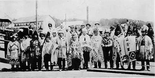 In large longhouses festivities and ceremonies take place. Things such as naming ceremonies, funerals, memorials for the deceased, weddings, and spiritual events, happen in their longhouses. Potlatch, elaborate events whose name is a Chinook Jargon word meaning to give involved a host or host family inviting guests to participate in a feast, dancing, and ceremonies. A person's position in the community is based on how much they gave of themselves to their people. As such, potlatches are hosted where gifts and material wealth is shared with the community.[29] Food is prepared and a large feast is given to the community. All the foods eaten by their ancestors are considered traditional foods and are usually accompanied in the feast celebrating their Indigenous culture. It was this event that was banned and made illegal by the Canadian government from 1884 to 1951. During that time, their ceremonies and events went underground, only to be revived years later.