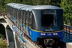 In November 2021, it was revealed that the new cars would carry the designation "Mark V". These would be the first SkyTrain vehicles made by French manufacturer Alstom after their acquisition of Bombardier Transportation in January 2021.[33] It was also at this time that a mockup was sent to TransLink to aid in the design phase.[33][34] As of 2020, the plan was to have one train to arrive per month between June 2024 and September 2027.[36] The order contains an option for the purchase of up to 400 additional cars to support future fleet expansion, replacement, and system extension projects.[37] Assembly for the first cars began in June 2022 at Alstom's Quebec manufacturing plant.[38] Minor construction work was in progress as of February 2023 at select Expo Line stations in order to prepare for the arrival of the first Mark V trains.[39] The first Mark V train was assembled and was undergoing testing at Alstom's facility in Kingston, Ontario, as of August 2023.[40] The first train arrived in December 2023 for testing.[41] In May 2024, Alstom announced that it would be manufacturing an additional 30 Mark V vehicles (six sets) at a cost of $68 million.[42] On March 8, 2025, TransLink had begun field testing of the Mark V trains. Passengers were not permitted to board the trains during testing. With the addition of the six extra trains, the entire fleet of Mark V trains is set to be fully deployed by 2029.[43] As of March 2025, four Mark V trains had been delivered.[44] The first Mark V train entered regular service on July 11, 2025.[45]