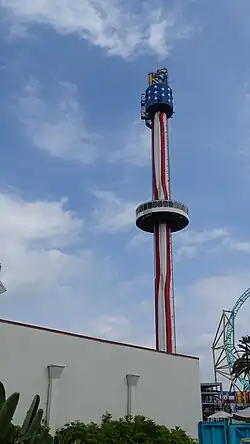 Sky Cabin is a 180-foot-tall gyro tower designed by Intamin, located at Knott's Berry Farm in Buena Park, California, USA. It is a slowly revolving viewing cabin, offering a panoramic view of Knott's Berry Farm and the surrounding land outside the park. On a clear day, Downtown Los Angeles can be viewed directly from the tower. The skyline of Disneyland and Disney California Adventure can also be viewed.[1] Before the announcement of the park's former Windseeker ride, Sky Cabin was a possible location to become replaced by Windseeker. Windseeker ended up opening in Fiesta Village and was later relocated to Worlds of Fun. It is one of the many existing attractions at the park operating before Cedar Fair took ownership of the park. It opened to the general public in 1976 as part of the former roaring 20's expansion area.[2]