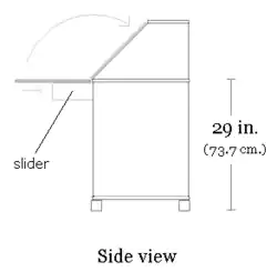The slant-top desk has also been mass-produced in a great quantity of sub-forms and materials. For instance, some slant-top desks have very crude chains or levers to hold the desktop in an open working position, while others have elegant sliders ("lopers") which are manually or automatically extended to give support.