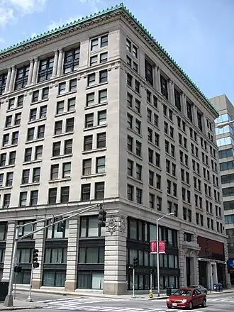 The Slater Building is an historic commercial building at 390 Main Street in Worcester, Massachusetts. The ten story building, built in 1907 by the Norcross Brothers, was the second skyscraper in the city (after the Second State Mutual Life building, 340 Main Street). Framed in steel, the building is clad in granite stone on its first two floors, while the upper floors are faced in limestone. The upper two floors are set off from those below by a trim line, and have a recessed loggia framed by Corinthian columns.[2]