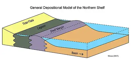 The region of Slaughter Field can be characterized by three main depositional environments: the shoals of the shelf margin, lagoonal evaporites, and the wackestones and packstones in the tidal flats. These environments result from the cyclic deposits in a regressive series. These deposits prograde to the south across the broad, shallow marine Northern Shelf.[3]
