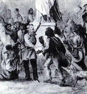 During the Wallachian Revolution of 1848, the agenda of the short-lived Provisional Government included the emancipation (dezrobire) of the Roma as one of the main social demands.[74] The Government decreed the complete emancipation of the Roma by compensating the owners and it made a commission (made out of three members: Bolliac, Ioasaf Znagoveanu, and Petrache Poenaru), which was intended to implement the decree. Some boyars freed their slaves without asking for compensation, while others strongly fought against the idea of abolition. Nevertheless, after the revolution was quelled by Ottoman and Imperial Russian troops, the slaves returned to their previous status.[75]