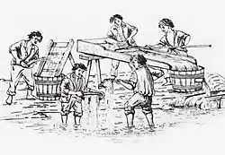 Each of the slave categories was divided into two groups: vătrași and lăieși; the former was a sedentary category, while the latter was allowed to preserve its nomadism.[19] The lăieși category comprised several occupational subgroups: alongside the Kalderash căldărari or "copper workers"), Lăutari ("string instrument players"), Boyash (lingurari or "spoon makers") and Ursari ("bear handlers"),[20] all of which developed as distinct ethic subgroups, they comprised the fierari ("smiths").[21] For a long period of time, the Roma were the only smiths and ironmongers in Wallachia and Moldavia.[22] Among the fierari, the more valued were the specialized potcovari ("farriers").[13] Women owned by the boyars were often employed as housemaids in service to the boyaresses,[23] and both them and some of the enslaved men could be assigned administrative tasks within the manor.[13] From early on in the history of slavery in Romania, many other slaves were made to work in the salt mines.[13]