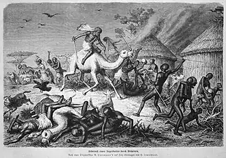 According to British explorer and abolitionist Samuel Baker, who visited Khartoum in 1862, six decades after the British authorities had declared the slave trade illegal, slavery was the industry "that kept Khartoum going as a bustling town".[11] Baker described the practice of slave raiding of villages to the south by Sudanese slavers from Khartoum: An armed group would sail up the Nile, find a convenient African village, surround it during night and attack just before dawn, burning huts and shooting. Women and young adults would be captured and bound with "forked poles on their shoulders", hand tied to the pole in front, children bound to their mothers. To render "the village so poor that surviving inhabitants would be forced to collaborate with slavers on their next excursion against neighboring villages," the village would be looted of cattle, grain, ivory, with everything else destroyed.[11]