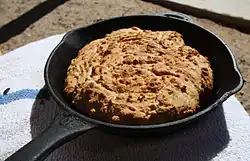 Enslaved people's diet was determined by what food was given to them, the mainstays being corn and pork.[27][57] At hog butchering time, the best cuts of meat were kept for the master's household and the remainder, such as fatback, snouts, ears, neck bones, feet, and intestines (chitterlings) were given to the slaves. Cornbread was commonly eaten by enslaved people, and there were many other ways that corn was prepared, such as porridge, hominy, grits, corn cakes, waffles, and corn dodgers.[58] Enslaved adults were typically given a peck (9 liters) of cornmeal and 3–4 pounds (1.5–2 kilos) of pork per week, and from those rations come soul food staples such as cornbread, fried catfish, chitterlings, and neckbones.[59]