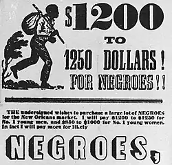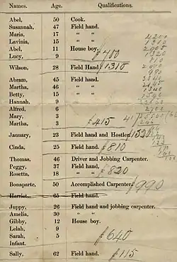 Slavery in the United States was a variable thing, in "constant flux, driven by the violent pursuit of ever-larger profits."[65] The enslaved labor force of the United States, while stereotypically drawn as field labor for the production of cash crops like sugar and cotton, performed nearly every type of skilled labor sought by the economy. An examination of 1200 runaway slave ads published in Tennessee found 25 blacksmiths, 18 carpenters, and 13 shoemakers, as well as barbers, boat builders, bricklayers, a "conjurer or fortune teller," cooks, coopers, cotton mill engineers, dressmakers (often called mantuamakers), hack drivers, iron furnace engineers, milliners, millwrights, ministers, musicians (most commonly of the fiddle/violin), a racehorse trainer, ostlers, plasterers, painters, seamstresses, stonemasons, tanners, a "turner and tin-plate workman," wagoners, waiters, and weavers.[66] Complex as it was, historians do know, however, that slavery in the United States was not a "deferred-compensation trade school opportunity."[67] Harriet Beecher Stowe summarized slavery in the United States in 1853:[68]