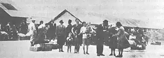 In July 1941, the Ustaše established a transit camp for Serbs and Slovenes in the town of Slavonska Požega (modern-day Požega, Croatia), 143 kilometres (89 mi) southeast of Zagreb.[17] The camp's establishment was overseen by the town's police chief, Milivoj Ašner.[18] A report submitted to the International Tracing Service (ITS) in the 1970s conservatively estimated that nearly 9,500 detainees had passed through the camp during its existence. Since this estimate was based on fragmentary documentation, the historian Joseph Robert White writes that the true number of detainees was probably higher.[17] It was not uncommon for detainees to be robbed of their belongings, physically abused, and sometimes even killed by escorting Ustaše.[19] The campgrounds, which consisted of barracks, a former arms depot and a military vehicle park surrounded by a wall with a barbed-wire fence, had originally been constructed by the Royal Yugoslav Army. The accommodations were insufficient to handle the large number of detainees, leading to severe overcrowding. The camp was commanded by Captain (Croatian: Satnik) Ivan Stiper. His adjutant, First Lieutenant (Croatian: Nadporučnik) Emil Klajič, commanded the 14th Ustaše Company, whose members guarded the camp. The company's strength varied between 130 and 223 men. Several Slovene detainees worked as part of the camp administration. Conditions at the camp were grim. Detainees were given inadequate amounts of food, illnesses ran rampant and medical treatment was virtually non-existent. Although it was nominally a transit camp, many detainees were tortured and even killed by the guards. On 26 August, 785 detainees from Derventa and Bosanski Brod were shot.[17] Among those killed at the camp was the Serbian Orthodox monk Rafailo, the abbot of the Šišatovac Monastery in northern Serbia, who was tortured to death.[20] The Slavonska Požega camp closed on 22 October 1941. The Ustaše administration continued to process belongings that had been stolen from the detainees until mid-November.[17]