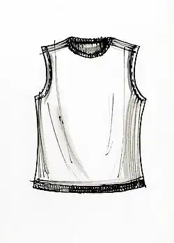 In the United States and Canada, any casual sleeveless shirt can be called tank top[1] or tank shirt,[2] with several specific varieties. It is named after tank suits, one-piece bathing suits of the 1920s worn in tanks or swimming pools.[3] The upper garment is worn commonly by both men and women. The build of a tank top is simple: the neck and armholes are often reinforced for durability. They often have large armholes and neck holes, which may reach down as far as the bottom of the chest; particularly low armholes are referred to as "dropped armholes." Women's tank tops have smaller holes, to conceal their breasts. They are also sometimes made long to make tucking into pants easier. In almost all cases, they are buttonless, collarless, and pocketless.