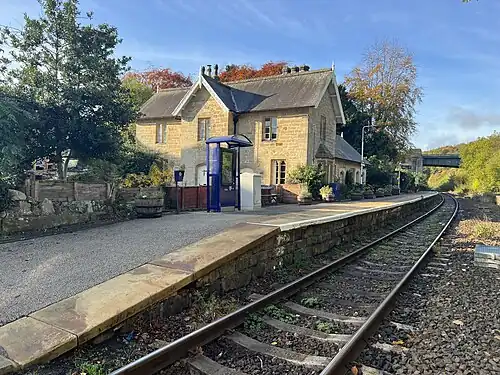 The station used to have two platforms for up and down line working,[4] but in common with the other stations between Grosmont and Whitby, this was reduced to single track working in 1984 when the second track was lifted and Sleights signal box closed.[5] Trains now stop at the former Up line platform,[6] where the main station buildings, including the station master's house, are now a Grade II-listed private residence.[7][8] The former down platform used to have a wooden waiting shed and store; this building was recovered by the North Yorkshire Moors Railway and re-erected on the extended down platform at Grosmont.[9]