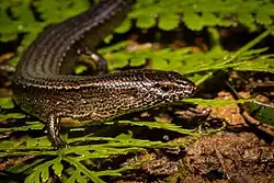 The slight skink (Oligosoma levidensum) is a skink of the family Scincidae, endemic to the far north of the North Island of New Zealand. The precise distribution is unknown; currently it is only known from localities in the Te Paki region of Northland. It closely resembles the copper skink, Oligosoma aeneum, and was considered to be a member of this species until recently when it was described as a new species using morphological, allozyme and DNA methods (Chapple et al. 2008). O. levidensum is difficult to distinguish morphologically from O. aeneum, which is probably why it had not been recognised until recently. The main distinguishing feature is the slighter overall body form of O. levidensum compared to O. aeneum. The limbs of O. levidensum are reduced compared to O. aeneum and O. hardyi, the other members of the O. aeneum complex.[2]