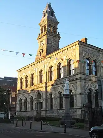 The foundation stone for the new building was laid by the mayor, William Abbott Woods, on 12 October 1865.[6] It was designed by William Hague in the Lombard Romanesque style, built by Crowe Brothers in rubble masonry with ashlar stone dressings at a cost of £6,863, and was opened for business in time for the a meeting of the council in July 1872.[7] Because of the very high standard of workmanship and associated cost over-runs, the building was not entirely complete until 1874.[8]