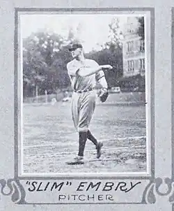 Charles Akin Embry (August 17, 1901 – October 10, 1947), was a Major League Baseball pitcher who played in 1923 with the Chicago White Sox. He batted and threw right-handed. Slim played baseball for the Vanderbilt Commodores from 1921 to 1923. The Commodores were champions of the Southern Intercollegiate Athletic Association in 1921,[1] and Slim was captain of the team in 1923. He was also a member of the basketball team in 1921–1922 and 1922–1923. Embry graduated from Vanderbilt with a degree in law in 1923.