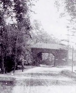 The history of Slingerlands begins in 1850 when the Albany, Rensselaerville, and Schoharie Plank Road Company was established by the state to construct a plank road from Albany, through Slingerlands, to Gallupville in Schoharie County.[1] In 1854, the state authorized the company to abandon or sell portions and to turn other sections (including that part in Slingerlands) into a turnpike and charge tolls.[2] The post office was originally called Normanskill and was built in 1852 with William H. Slingerland as the first post master.[3] In 1863, the Albany and Susquehanna Railroad was built through Slingerlands with a station established here as well.[4] William H. Slingerland was the surveyor of the road, and since his route came in $600,000 less than a previous survey the company named the station here Slingerlands in his honor.[5] In 1870, the post office also took the name Slingerlands.[3] After having been in the rear of a grocery store for a hundred years it moved to the Tollgate Building in 1953, until the 1990s when a newer larger location was built near the Price Chopper Plaza.[6][7] In 1989, the New Scotland post office was closed and the 400 residents it served were transferred to Slingerlands' ZIP Code.[7]