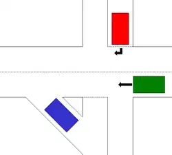 When poorly designed, slip lanes can be a dangerous design element. For reasons of urban design and pedestrian safety, many road-controlling authorities are actively removing them in urban and suburban settings.[11][12] Slip lanes may need to be removed if considerations such as pedestrian safety grow to a point that they override the desire to facilitate free passage for drivers.[13][14] "Slip lanes reduce drivers’ awareness of crossing pedestrians because they are led to focus on the traffic stream into which they are merging, and also impair visibility of the traffic stream because of the angle of approach."[15] As well, "[s]lip lanes also greatly increase crossing complexity for pedestrians and cyclists, by increasing total crossing distance, requiring judgement about crossing fast-moving traffic without the benefit of a traffic signal."[16] To minimise risks of collision, slip lanes can be shaped to enter the traffic flow at an angle higher than the 45 degrees that is shown in the sketch. Such lanes are called high-entry angle slip lanes.[17]