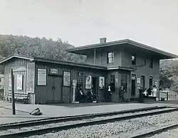 The Erie Railroad was constructed through Sloatsburg from 1836 to 1841, helping with the prosperity of the village, along with its population.[4] The station was also near the Sterlington one, but it never served of great importance.[5] The Sloatsburg station building was built in 1868 as a two-story brick facade with a tin roof. The style of the building, according to the railroad's 1920 engineering report, is a Type 6A style, with dimensions of 17' x 29.5' x 19'. The station was equipped to host as a base for XG Radio from the Suffern Tower (SF) in Suffern.[6] The Sloatsburg station served well for the nearby Greenwood Lake, with a stagecoach leaving the station three times day. The stagecoach was mainly inhabited by fishermen on their way to Greenwood Lake.[7]