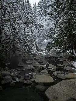 The hot spring emerges at a temperature of 64 °C.[3] A small waterfall of very hot water flows out of the steep vertical bank of Sloquet Creek and flows into two small soaking pools. Downstream is the larger, shallow soaking-pool similar to a typical creek bed but hot. The waters of the upper two pools and the waterfall may be too hot for bathing.[4] Supernatant liquid is a layer of cool water that floats on top of the denser, hot, mineral-rich hot springs outflow. The water should be tested the for temperature by dipping a container into the water before entering the water. Another large soaking pool located further down the creek bed is a more comfortable soaking temperature. An adjacent glacier-fed river provides opportunities for Roman or Turkish style bathing, of alternating hot and cold dips. Camping is available at the site, but there are limited services.[1]