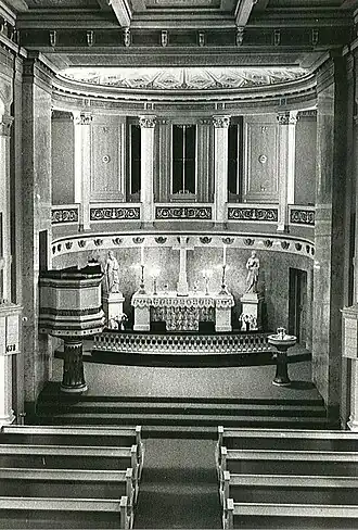 The dados along the side aisles feature plaster reliefs of the four evangelists by the sculptor Hans Michelsen. The wall behind the altar with a gilded cross in the middle is made of pink stucco marble and the church organ is located in the gallery above. Olav Glosimodt has created the marble figures showing the apostles Peter and Paul. The pulpit is white and gold.[1][2][4]