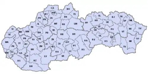 There are 79 districts in Slovakia. In 69 cases, the district is named after and the code derived from its principal city which is included in the district. Two cities, Bratislava (the capital) and Košice (KE), consist of 5 and 4 districts respectively. This fact is not reflected on the plates, only one code is used. Additionally, Košice-okolie (KS) comprises an area around Košice (the city itself excluded) while having its seat in the city proper. Each district is assigned at least one code. Ten cities including eight seats of the region (kraj) are assigned more. Since 18 August 2010, Bratislava has been registering plates with its second code, BL.[2] The Ministry of Interior of the Slovak Republic held a Facebook poll as the reaction to public dissatisfaction of Bratislava inhabitants with the previously intended BD code. As the combinations of the BL code are to be exhausted soon, another Facebook poll was organised in November 2018. Participants were asked to vote for the next code in three rounds (two semi-finals and one final). As much as 89% opted for the BT code over the BE.[3] Bratislava is the only okres to do so and will remain in this position as since 2023 district codes were abolished.