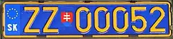 - Regular plates are the most commonly used of all the types. They contain seven characters starting with the district code (see below) followed by a series of 3 numbers and 2 letters. The number series used are between 001 and 999. The letter series are between AA-XZ and ZA-ZZ. 24 letters are used (excluding Q, W and Slovak letters such as Š). Progression: 001AA-002AA...999AA, then 001AB...999AB. 999AZ is followed by 001BA through 999BB etc. Only Bratislava has reached 999ZZ as of February 2011.