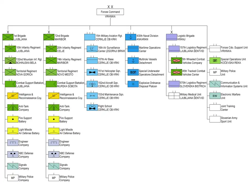 A major reorganization of the Slovenian Armed Forces is currently underway with a goal of making them more effective and to increase the defense budget to the NATO required 2%.[5] The goal is set to be accomplished near year 2030. More than half of all commands have been disbanded which has made commanding the subordinated units easier and faster. Soldiers are to be located nearer to their homes in order to minimize travel costs. Since the Slovenian Armed Forces do not have enough modern armored vehicles to maintain three motorized battalions fulfilled at every time, one Wheeled Combat Vehicles Company and one Tank Company have been organized within the Logistics brigade, which now lends vehicles to any of four newly formed infantry regiments, regarding to the regiments' needs. Reorganization also transformed 72nd Brigade from a support unit to a combat unit and thus equaled it with the 1st Brigade. Both brigades were added support elements, such as Air Defense, Artillery, Intelligence, etc. The operational units now consist of a Special Operations Unit, Naval Division, an Aviation Regiment and three brigades, the 1st (responsible for western Slovenia), 72nd (responsible for eastern Slovenia) and Logistics Brigade.