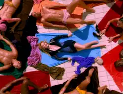 The accompanying music video for "Slow" was directed by Baillie Walsh and choreographed by Michael Rooney.[51] The video was shot in Barcelona, Spain,[52] and begins with a scene of a man diving into the Piscina Municipal de Montjuïc swimming pool[53] and coming out of its edge, where a number of very lightly beachwear-clad people are sunbathing. Minogue stands out in a series of different zoom central shots lying on a sky-blue towel wearing a dark blue bodyhugging Balenciaga dress.[50] The next scenes of the video capture her singing the song through different camera angles, particularly during the chorus when the camera angle shifts to a "bird's eye" view and show Minogue amid beach models performing synchronised choreography to the dance beats.[52] A reviewer from District MTV commented that the video showed that "synchronised sun bathing is more fun than it sounds".[52] Ben Taylor from Swide Magazine included the video in his list of Minogue's "Best Music Video Moments".[54] Used for promoting the song, the video premiered earlier than the song's release date, on 21 October 2003.[51] Minogue talked about the video, saying: