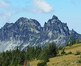 Sluiskin Mountain[3] is a prominent pair of summits located in Mount Rainier National Park in Pierce County of Washington state. It is situated northwest of Burroughs Mountain and is part of the Cascade Range. The higher rocky peak is known as The Chief (7026 ft), and the second peak to the west is known as The Squaw (6960+ ft).[4] West of The Squaw are pinnacles called The Papooses.[5] Sluiskin was the native American guide who assisted with the first successful ascent of Mount Rainier by Hazard Stevens and P. B. Van Trump in 1870. Sluiskin Falls within the park also honors him.[6]