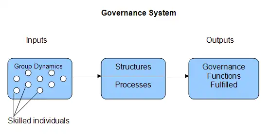 A more comprehensive way of looking at governance is to view it as the sum of these perspectives. One way of connecting all of these aspects of governance is to visualize a governance system (see below). The individual competencies and resulting group dynamics between the individuals can be seen as the inputs into the system. Those skills and group processes are then applied through the structures and processes that are in place, resulting in governance (the outputs).[10]