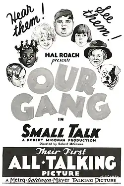 Small Talk is a 1929 American Our Gang comedy short film directed by Robert McGowan.[2] Produced by Hal Roach and released to theaters by Metro-Goldwyn-Mayer, it was the 86th entry in the Our Gang series to be released,[3] and the first to be made with sound.[4]