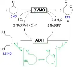 The concept of a smart cosubstrate was developed further through the design of a new class of redox-neutral "convergent cascade" reactions. Convergent cascade reactions involve a bi-substrate and a single product without the formation of an intermediate and were developed for the production of epsilon-caprolactone, which consists of a Baeyer-Villiger monooxygenase; for the oxidation of cyclohexanone; an alcohol dehydrogenase for oxidation of the "double-smart cosubstrate" 1,6-hexanediol; and for simultaneous regeneration of the nicotinamide cofactor.[9] In 2016, two-step optimization of the convergent cascade by Design-of-Experiments and a biphasic system was reported.[10]