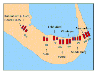 In its first year only Amsterdam and the Danes occupied Smeerenburg, the former to the east and the latter to the west. In 1619 and 1620 the Danish ships that went to Smeerenburg were sent by merchants from Copenhagen, while those that went there in 1621 and 1622 were sent by a royal undertaking. In 1623 two Basque ships employed by the Danes arrived at Smeerenburg and began taking whaling gear from the Danish huts before they were driven away by the Dutch. In 1625, when the Danish-employed Basque ships arrived at their place in Smeerenburg they found that their station had been damaged, the work of the Dutch and English in the previous season.[4] After 1625 the Danes were expelled by the Dutch, their place being occupied by the Hoorn, Enkhuizen, and Vlissingen chambers. By 1626 there were five big "huts" at Smeerenburg, and by 1633 all the chambers of the Northern Company were represented at the settlement.[5]