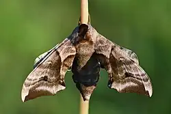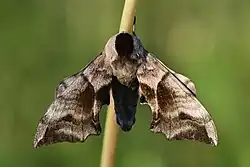 The adult (imago) is very similar in appearance to the other two western Palaearctic Smerinthus species, Smerinthus caecus and Smerinthus kindermannii but differentiated by an apical thorn on the foretibia, and the large, circular hindwing ocellus. The upperside forewings are marked in light and dark shades of brown and resemble the colouring of bark. The hindwings are pink coloured basally and then a yellow ochre. The hindwings are dominated by a large, blue, dark-centred and black-rimmed eyespot. The thorax has light brown sides and dark brown hairs in the middle. In addition to variations in the density of the forewing pattern intensity, differences in colour are also found on the hindwing. In f. flavescens Neumann hindwing pink is replaced by yellow in f. pallida Tutt by grey and in f. albescens Tutt. In f. rosea Bartel, the pink is deep and the forewings are yellowish brown; in f. ollivryi Oberthür, the ocellus is replaced by a buff brown patch. The adult moth has a wingspan of 70–80 millimetres (2.8–3.1 in).[3]