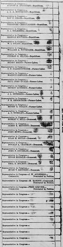In the at-large 1932 House elections, eighty-eight candidates filed to run; the ballot for the general election contained thirty candidates: nine from each of the three major parties plus three Communists who had been nominated by petition.[6] All but two of the incumbent congressmen were ousted; the Farmer-Labor Party took five of the nine seats while the Republican delegation was reduced from nine congressmen to three.[2]