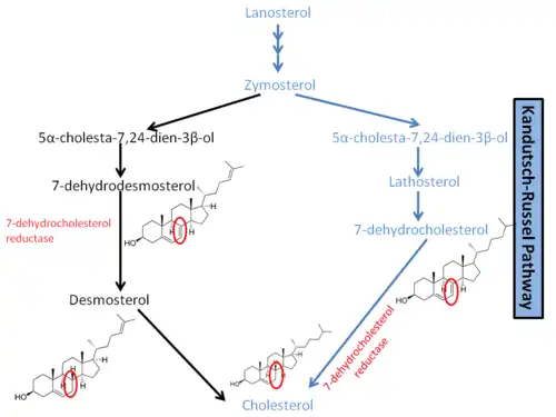 Through a complicated series of reactions, lanosterol leads to the formation of zymosterol. As shown in a diagram to the right, it is at this point that the pathway diverges. In humans, the main pathway leading to cholesterol is known as the Kandutsch–Russell pathway.[3] Zymosterol is metabolized to 5α-cholesta-7,24-dien-3β-ol, then to lathosterol, and then to 7-dehydrocholesterol, or 7-DHC. 7-DHC is the immediate precursor to cholesterol, and the enzyme DHCR7 is responsible for converting 7-DHC to cholesterol.[1] DHCR7 reduces the double bond on carbon 7 of 7-DHC, leading to the unesterified product.[9] Mutations in this enzyme are responsible for the wide range of defects present in SLOS. In another pathway leading to cholesterol synthesis, DHCR7 is required for the reduction of 7-Dehydrodesmosterol to desmosterol.[1]