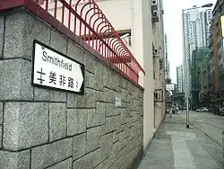 On 2 February 2007, the Lands Department proposed to rename Smithfield (士美非路) as Smithfield Road (士美菲路).[2] However, the idea to add the word "Road" was opposed on the ground that the street name was unique in that it was named after and had a similar historical development as Smithfield, London. On 18 October 2007, the Government amended the proposal and announced that only the Chinese name of the street would be changed (from 士美非路 to 士美菲路).[30] The name change became official on 14 December 2007.[31]