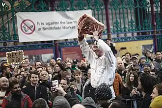 The Smithfield Market Christmas Eve meat auction is an annual holiday tradition in London. Every year, buyers visit the historic London market to buy surplus cuts of meat in cash-only bargain transactions.[1][2] It is a tradition that spans back to 1327,[3] a pre-refrigeration era when meat had to be sold quickly or risk going bad.[2]