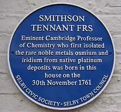 Tennant was born in Selby in Yorkshire. His father was Calvert Tennant (named after his grandmother Phyllis Calvert, a granddaughter of Cecilius Calvert, 2nd Baron Baltimore). His own name derives from his grandmother Rebecca Smithson, widow of Joshua Hitchling. He attended Beverley Grammar School and there is a plaque over one of the entrances to the present school commemorating his discovery of the two elements, osmium and iridium. He began to study medicine at Edinburgh in 1781, but after a few months moved to Cambridge, where he devoted himself to botany and chemistry. He graduated M.D. at Cambridge in 1796,[3] and about the same time purchased an estate near Cheddar, where he carried out agricultural experiments. He was appointed professor of chemistry at Cambridge in 1813, but lived to deliver only one course of lectures, being killed near Boulogne-sur-Mer by the fall of a bridge over which he was riding.