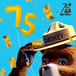 For his 75th birthday in 2019, the Smithsonian's National Zoo in Washington D.C. opened an outdoor exhibit on May 23, 2019. Fourteen posters and multiple archival photographs of the original bear line the pathway in front of Smokey Bear's original habitat. At the entrance stands a 6-foot-tall statue of his cartoon persona.[65] Along with the exhibit, new commercials and promotional materials were released, and events were held throughout the U.S. The NAL showcased movies, commercials, and paintings at their Beltsville location, materials were loaned to government agencies, and materials were provided to travel to various National Forests across the country throughout 2019.[66]