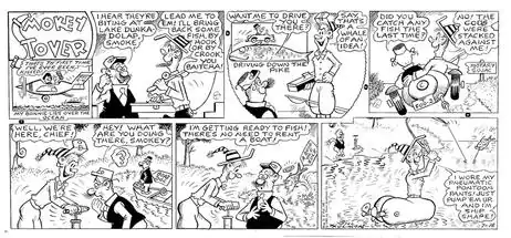 Spooky, who makes frequent cameo appearances in Smokey Stover, also regularly turns up in the background of Holman's daily gag panel feature, Nuts and Jolts. Syndicated for more than three decades from July 8, 1935, to 1970, Nuts and Jolts was a stand-alone panel cartoon featuring an ever-changing cast of everyday people doing silly things.[15]