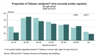 At the time of the 2011 Tokelau Census 23.1% of Tokelau's 15- to 19-year-olds smoked cigarettes regularly. This figure has dropped markedly since 2006, when 40.4% of 15- to 19-year-olds smoked regularly.