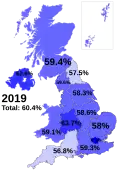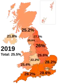 Smoking prevalence varies with geography. In self-reported Annual Population Survey data, the local authorities of Kingston upon Hull and Blackpool had consistently high smoking prevalence rates of 22.2% and 23.4% respectively in 2019, while Ribble Valley and Rushcliffe had rates of 5.1% and 5.9%.[22] It is estimated that in some of the most deprived communities in Scotland, smoking rates may be as high as 47%. An estimated 40% of adults smoke in the constituency of Glasgow East, one of the most deprived seats in the entire United Kingdom.