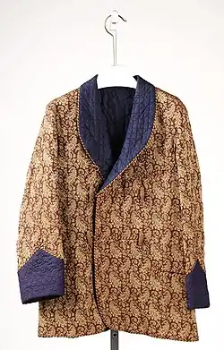 A smoking jacket is an informal men's style of lounge jacket originally intended for tobacco smoking. Designed in the 1850s, a traditional smoking jacket has a shawl collar, turn-up cuffs, and is closed with either toggle or button fastenings, or with a tie belt. It is usually made from velvet and/or silk.