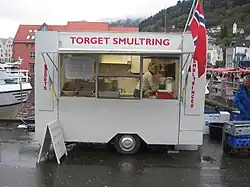 Smultringer are torus-shaped and sold from trucks and, at Christmas time, from stalls. They are described as being "thick, heavy dough fried in lard that are best eaten while hot and with the grease still dripping".[2] Smultringer are popular with expatriate Norwegians, including those in Minnesota who serve them with krumkake and riskrem (rice whipped cream), and fattigmann at Christmas dinners.