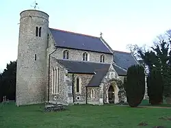 There has been a church in Snailwell since at least the 11th century and the present parish church dates from this period. Now dedicated to St Peter, it was dedicated to St Andrew in the 13th century. The current building consists of a clerestoried nave with north and south aisles, chancel and a circular west tower, one of only two round-tower churches in Cambridgeshire (the other being in Bartlow). The tower is the oldest part of the church and was built in the 11th century. It had a lead spire until the mid-19th century. The chancel dates from the 13th century.[3]
