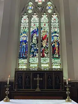 At the south end of the main range there is a chapel, which was added in 1860, indicated by dated rainwater heads to the walls. Internally, the chapel has a wide chancel arch with a canted apse and some stained glass windows, depicting the Life of Christ and Acts of Mercy, by William Morris.[2] It is two-storeys high and is six bays long by five bays wide. It has a quarry-faced plinth, ashlar quoins and stepped buttresses between Perpendicular windows to the ground floor. The chancel window has four trefoil-headed lights beneath more elaborate curvilinear tracery.[3]